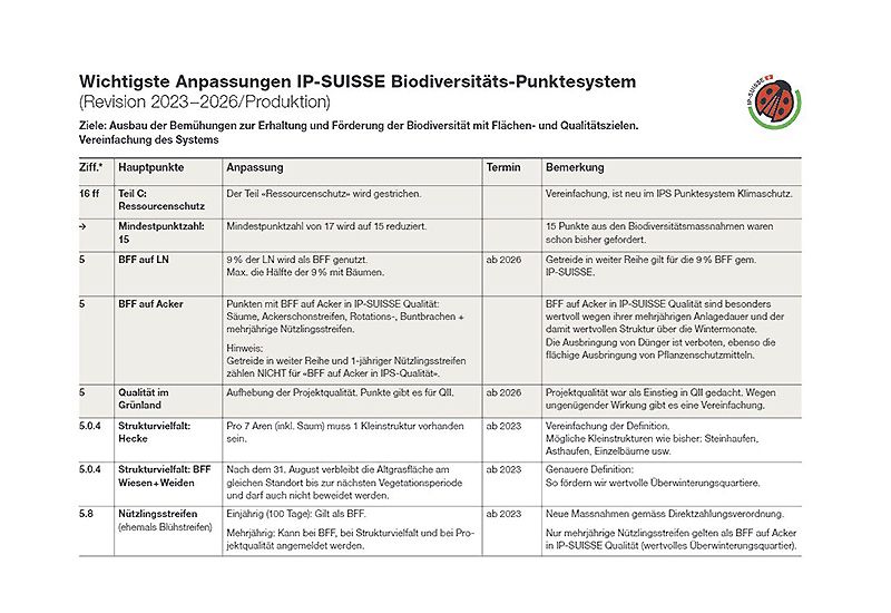 Die Grundlagen dafür haben Wissenschaftler der Schweizerischen Vogelwarte in Zusammenarbeit mit einer Arbeitsgruppe des Vorstandes erarbeitet. «Mit der Weiterentwicklung werden die Massnahmen gestrafft und noch deutlicher auf die Ziele fokussiert», schreibt die IP-Suisse. Nebst Neuerungen und Anpassungen werden «griffigere» Vorgaben eingeführt, die vor allem auf die Qualität der Biodiversitätsförderflächen abzielen. Die rund 18'500 IP-Suisse-Betriebe werden in diesen Tagen über die Neuerungen informiert.