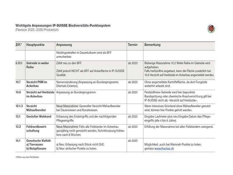 Für die Umsetzung der Kernpunkte (Schwellenwert BFF von 9 Prozent sowie das Ablösen der Projektqualität auf Grünland durch QII-Massnahmen) erhalten die Betriebe drei Jahre Zeit zur Umsetzung. Der Teil Ressourcen, der neu im IP-Suisse-Punktesystem Klimaschutz angerechnet werden kann, wird gestrichen. Dafür gilt nun gesamthaft die Mindestpunktzahl von 15 aus den Biodiversitätsmassnahmen.