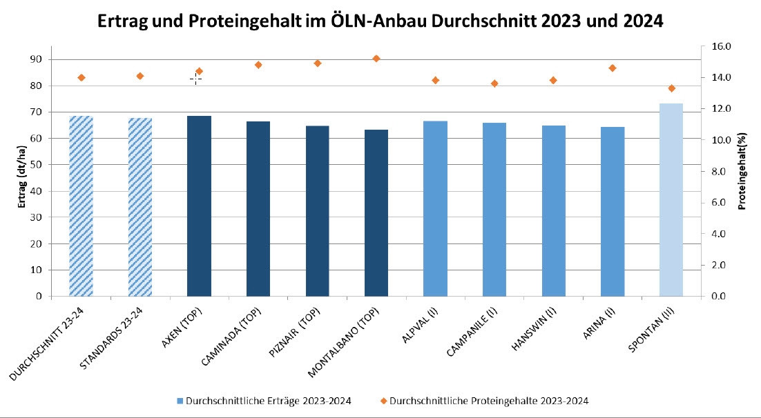 Durchschnittlicher Ertrag (bei 15 % Feuchtigkeit) und durchschnittlicher Proteingehalt der Winterweizensorten, die 2023 und 2024 unter ÖLN-Bedingungen geprüft wurden. Montalbano, Alpval und Spontan dienten als Standardsorten.