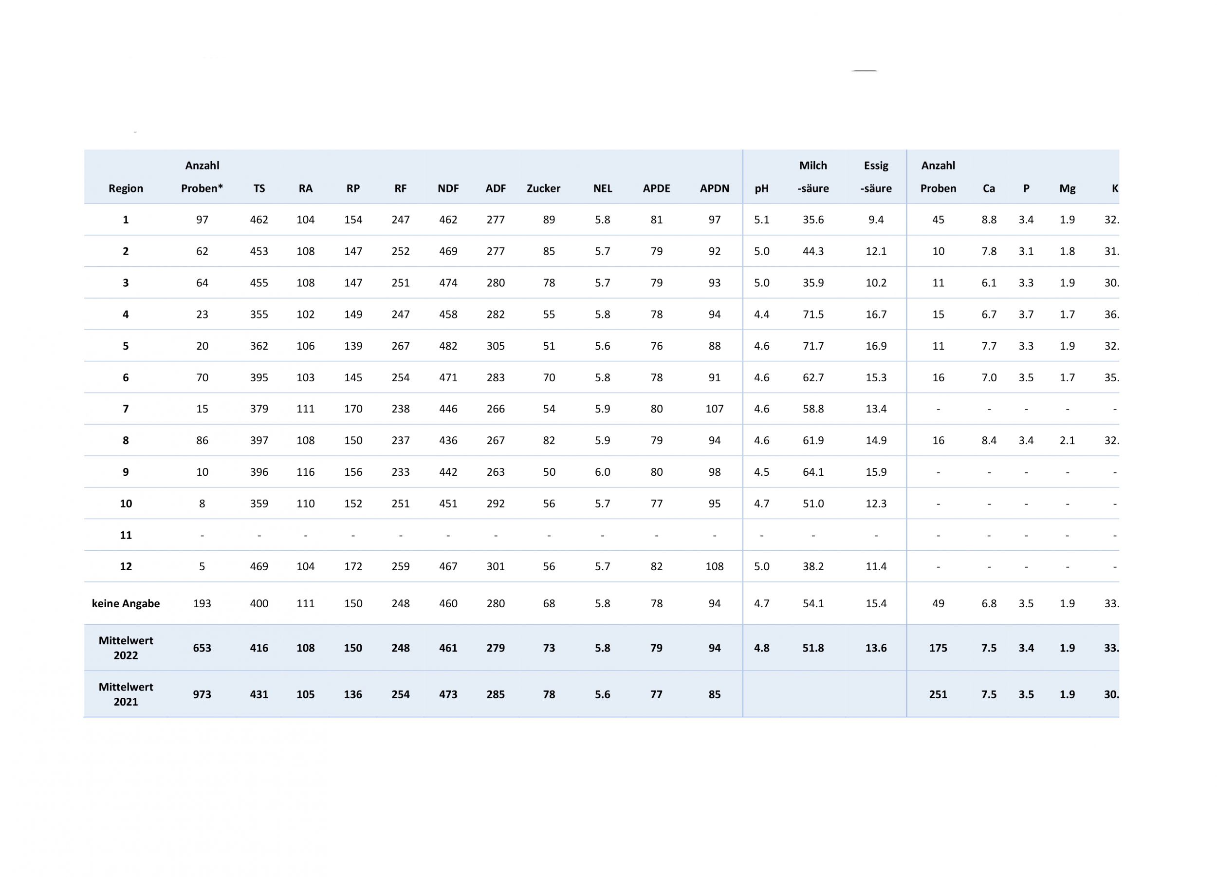 Die Auswertung der Gras- und Maissilagen 2022 basiert auf den analysierten Futterproben der Laboratorien UFAG AG und Eurofins. Viele der analysierten Proben der beiden Laboratorien können leider nicht zugeordnet werden, da die Postleitzahlen fehlen. Diese Analysen könnten einiges zu besseren oder aussagekräftigeren Werten beitragen. Schade, dass wir sie nicht nutzen können.