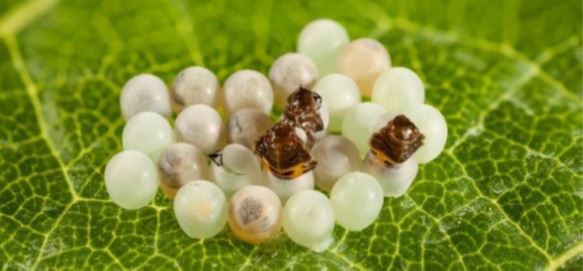 lebensfähige Eigelege der Marmorierten Baumwanze auf einer Birnenparzelle