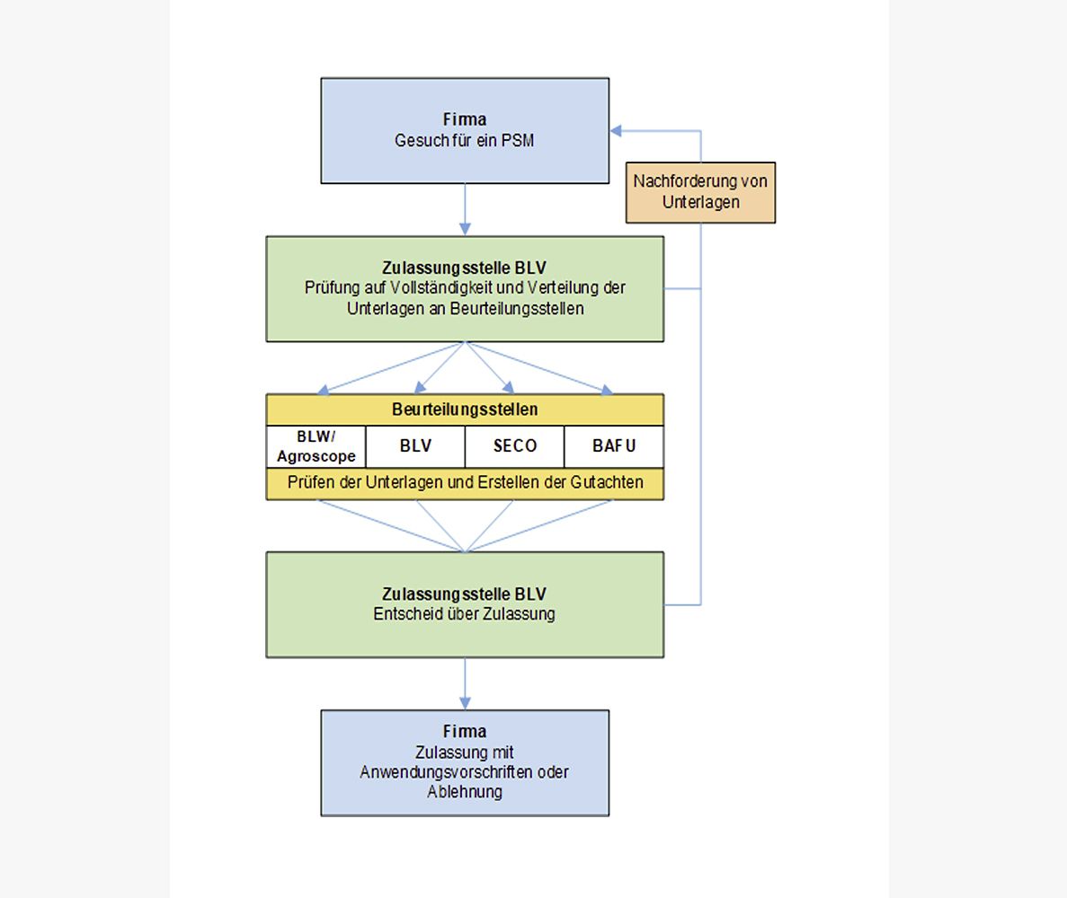 Eine Gesuchstellerin, die ein neues Pflanzenschutzmittel (PSM) in Verkehr bringen will, reicht bei der Zulassungsstelle ein Gesuch inklusive aller erforderlichen Dokumente und Studien ein. Ist das Dossier komplett, wird es durch die Zulassungsstelle an die zuständigen Beurteilungsstellen weitergeleitet. Die wissenschaftliche Beurteilung der eingereichten Studien erfolgt durch das Bundesamt für Umwelt (BAFU), das Bundesamt für Landwirtschaft (BLW) mit seinen Forschungsanstalten (Agroscope), das Bundesamt für Lebensmittelsicherheit und Veterinärwesen (BLV) sowie das Staatssekretariat für Wirtschaft (SECO). Fehlen Informationen, werden sie bei der Firma nachgefordert.