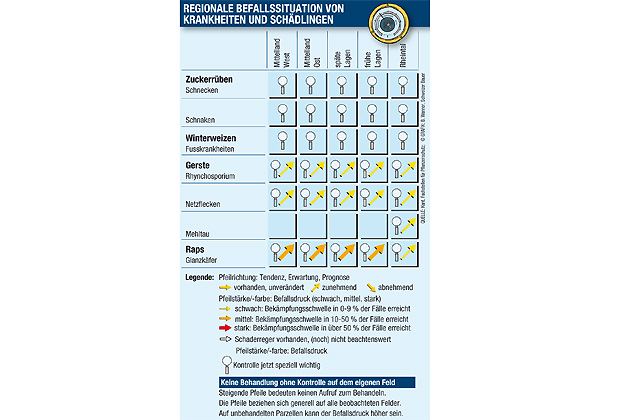 Wintergerste: Bei der Gerste ist der erste oder der zweite Halmknoten nun fühlbar (Stadium (31 bis 32). Frühe Bestände sind schon weiter entwickelt. Der Befall mit Rhynchosporium und Netzflecken ist lokal unterschiedlich stark ausgeprägt. Generell ist der Kranheitsdruck eher tief. Mehltau wurde bislang hauptsächlich im Rheintal in dichten Beständen gesichtet. Zum Zeitpunkt der Halmverkürzung ist der Befall mit Pilzkrankheiten (Spitz- und Netzflecken, Mehltau) zu überprüfen. Bei einem Befall über der Bekämpfungsschwelle kann ein Fungizid zugemischt werden. Bei leichtem Befall kann darauf verzichtet werden, da bei Gerste sehr bald die Fungizidbehandlung im Fahnenblattstadium folgen wird. Die Bekämpfungsschwelle beträgt beim Mehltau 25 bis 50 Prozent Blätter mit Befall, bei den Netzflecken 15 bis 25 Prozent. Rhynchosporiumbefall ist bei den Kontrollen zum Netzfleckenbefall dazuzuzählen.