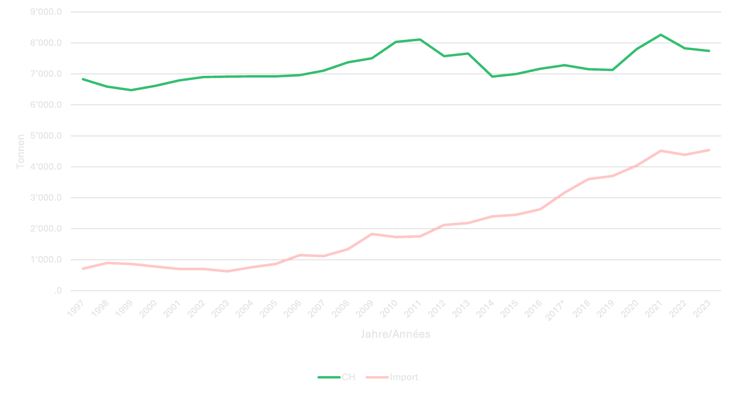 Entwicklung der Schweizer Champignons-Produktion im Vergleich zu den Importen.