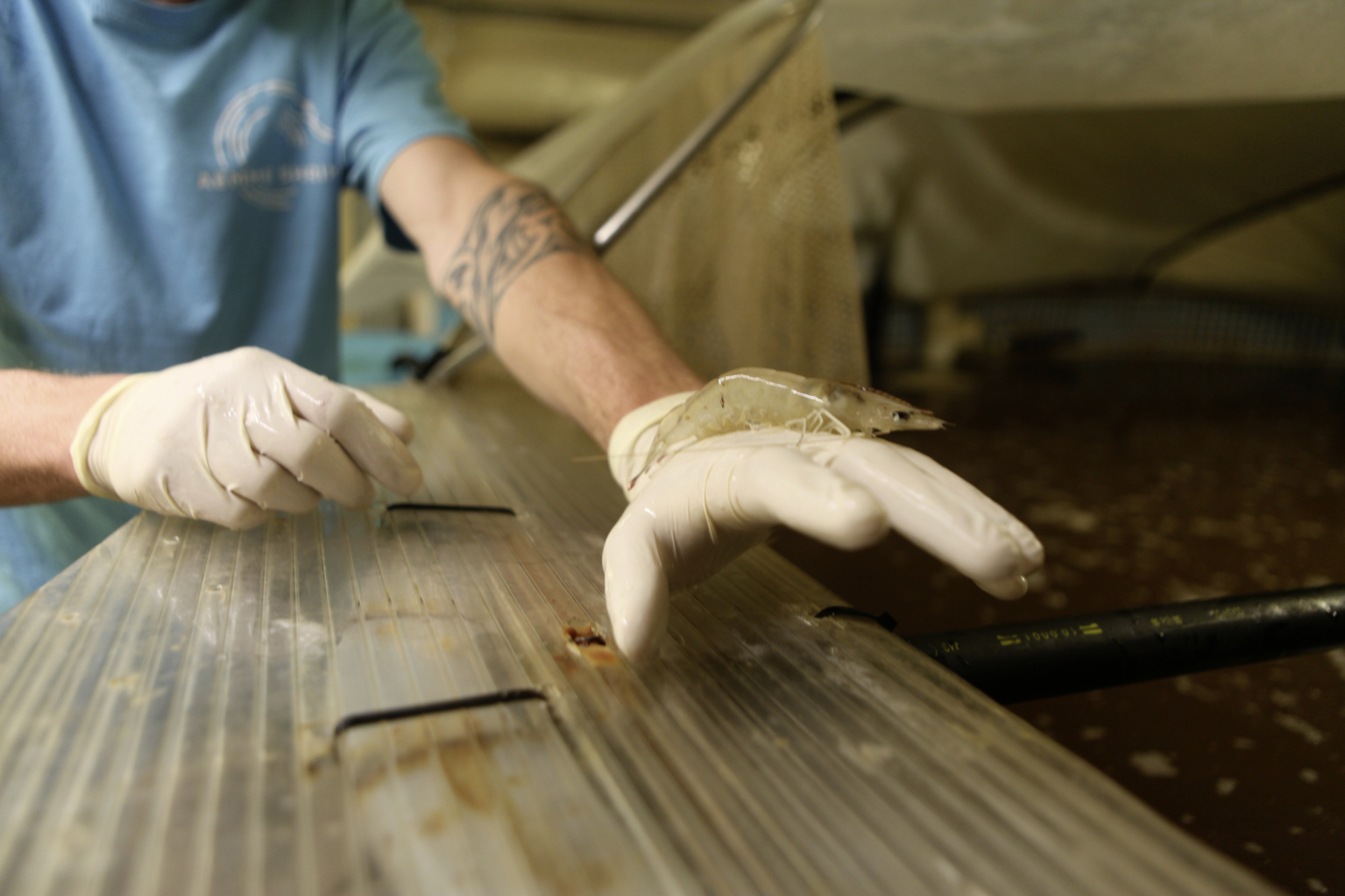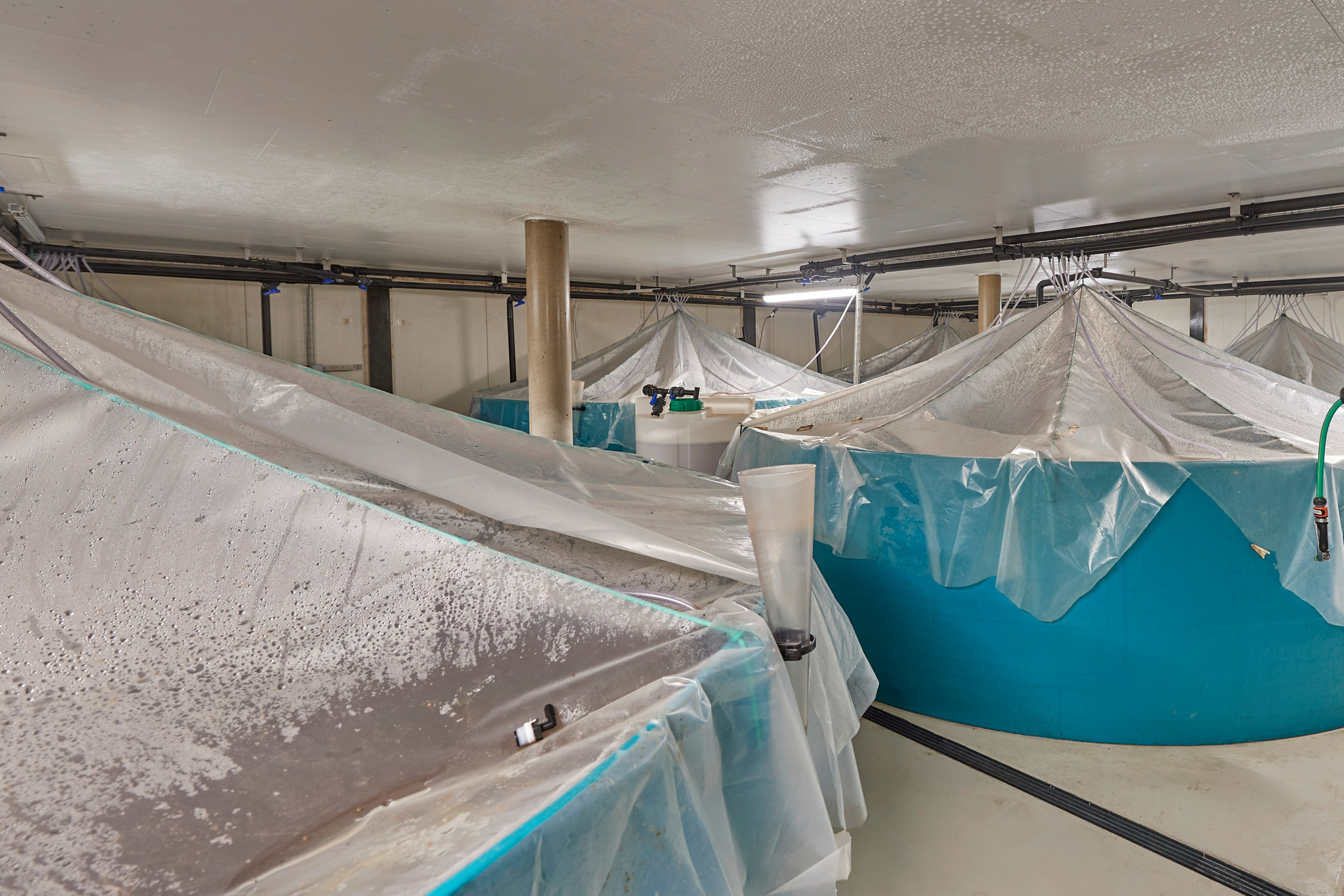 Die sogenannte Biofloc-Technologie ermöglicht ausserdem einen geschlossenen Wasserkreislauf, wodurch das Wasser nicht gewechselt werden muss. Das Wasser wurde mit Salz und Bakterien angereichert, wobei Letztere die Ausscheidungen und Schalen der Tiere – Garnelen häuten sich alle zwei Tage – zersetzen.