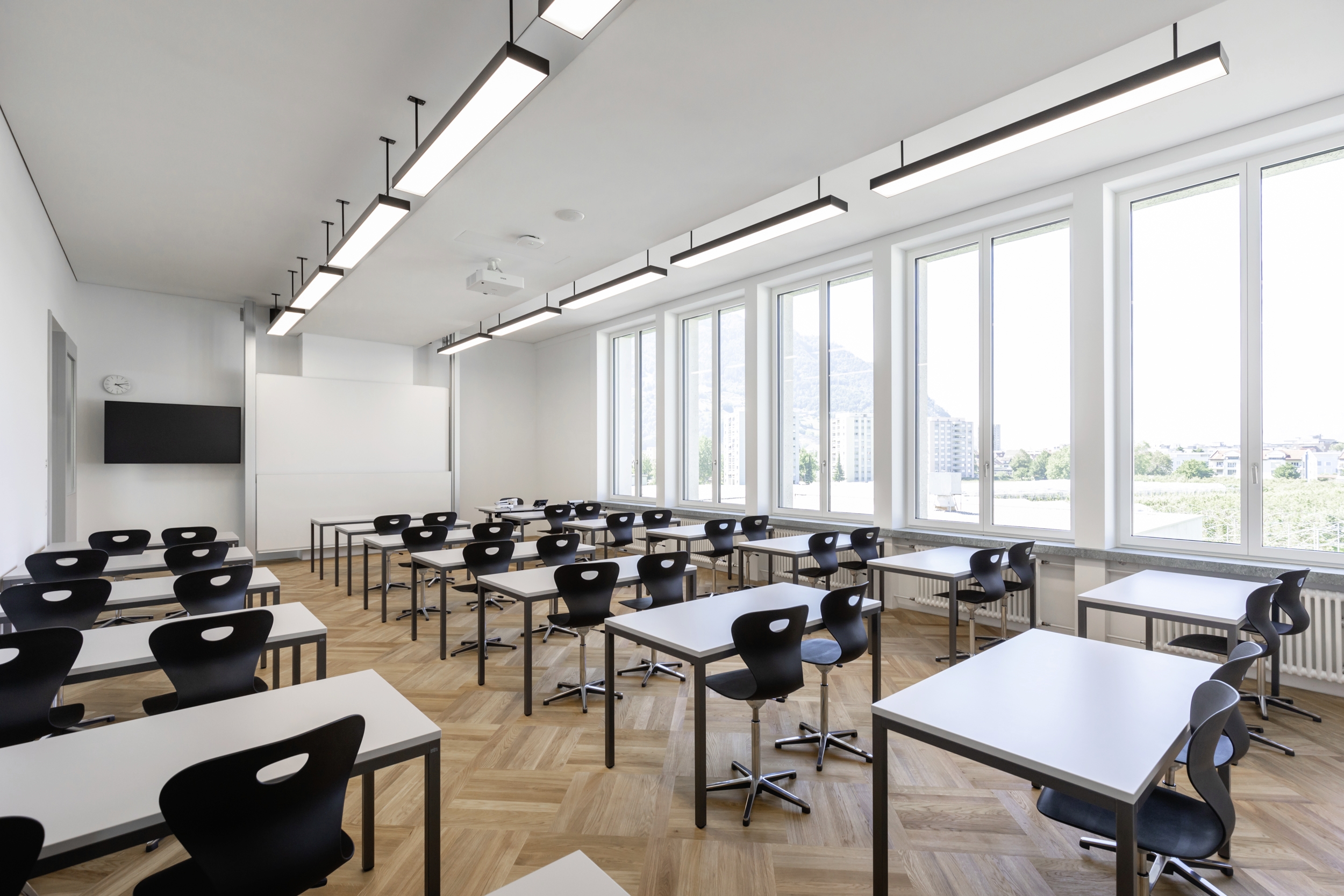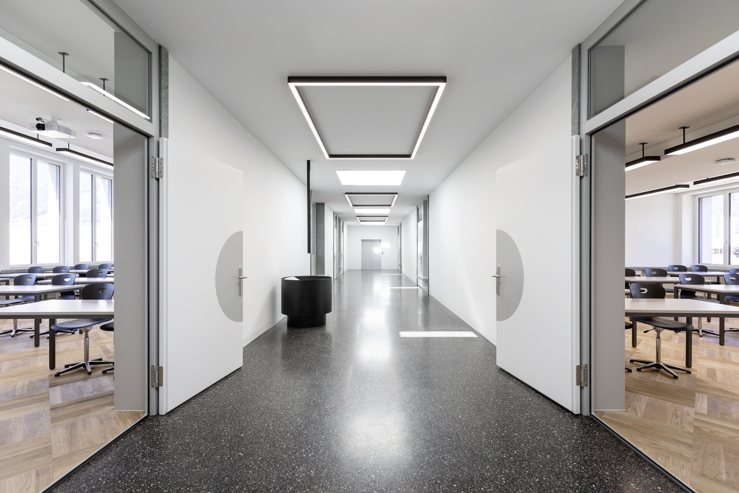 Drei Zugänge und ein zentral gelegener Aufzug garantieren die barrierefreie Erreichbarkeit der Schulräume. Die Klassenzimmer sind gemäss Kanton lernfördernd gestaltet, aktiv belüftet und mit moderner Medientechnik ausgestattet.