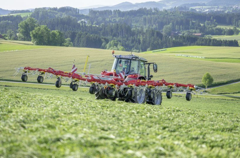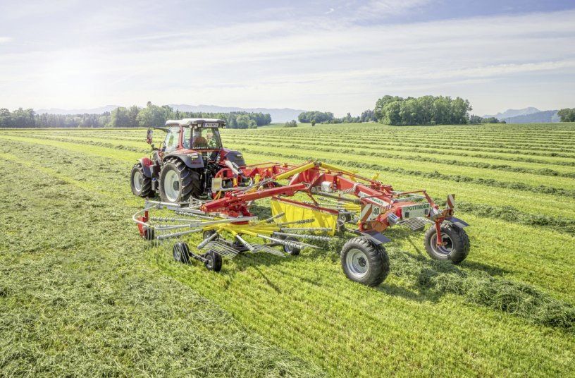 Die Baureihe der Mittenschwader von Pöttinger wird mit dem neuen TOP 882 C erweitert. Er spiele seine volle Stärke bei einer Arbeitsbreite von 7,70 bis 8,80 m aus, hält Pöttinger fest. Durch den längeren Ausleger ist eine sehr flexible Schwadbreite von 1,30 bis 2,60 m möglich. Das bietet den Vorteil von breiteren Schwaden für Feldhäcksler und minimalen Schwadbreiten für kleine Ladewagen. Trotz des beachtlichen Kreiseldurchmessers von 3,70 m bleibt die Transporthöhe mit montierten Zinkenarmen unter 4,00 m.