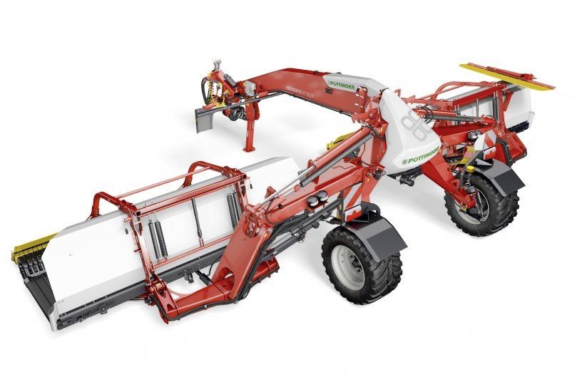 Die Kinematik des Auslegers mit drei Hydraulikzylindern reagiert rasch auf jede Bodenunebenheit. Im Mittenschwad-Modus beträgt die Höhenbeweglichkeit +475 mm bis -195 mm und die Querpendelung +30 Grad bis -13 Grad. Die Neigung in Fahrtrichtung kann sich von +11,5 bis -0 Grad anpassen.