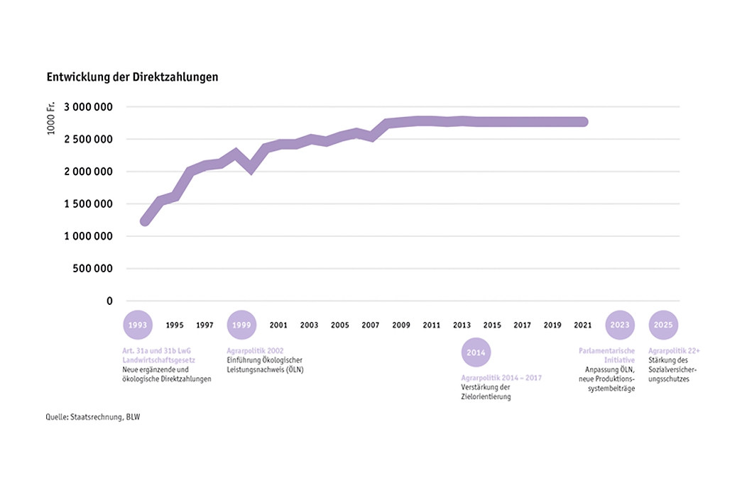 Per 1. Juni 1993 hat der Bund die neuen ergänzenden und ökologischen Direktzahlungen eingeführt. Dies war ein agrarpolitische Wende: Denn mit der Einführung der Direktzahlungen wurde die Preis- und Einkommenspolitik entkoppelt. Gleichzeitig wurden gezielte Anreize für eine ökologischere Landwirtschaft geschaffen. Die Direktzahlungen von rund 2,8 Milliarden Franken pro Jahr sind neben dem Grenzschutz das wichtigste Instrument der Schweizer Agrarpolitik.