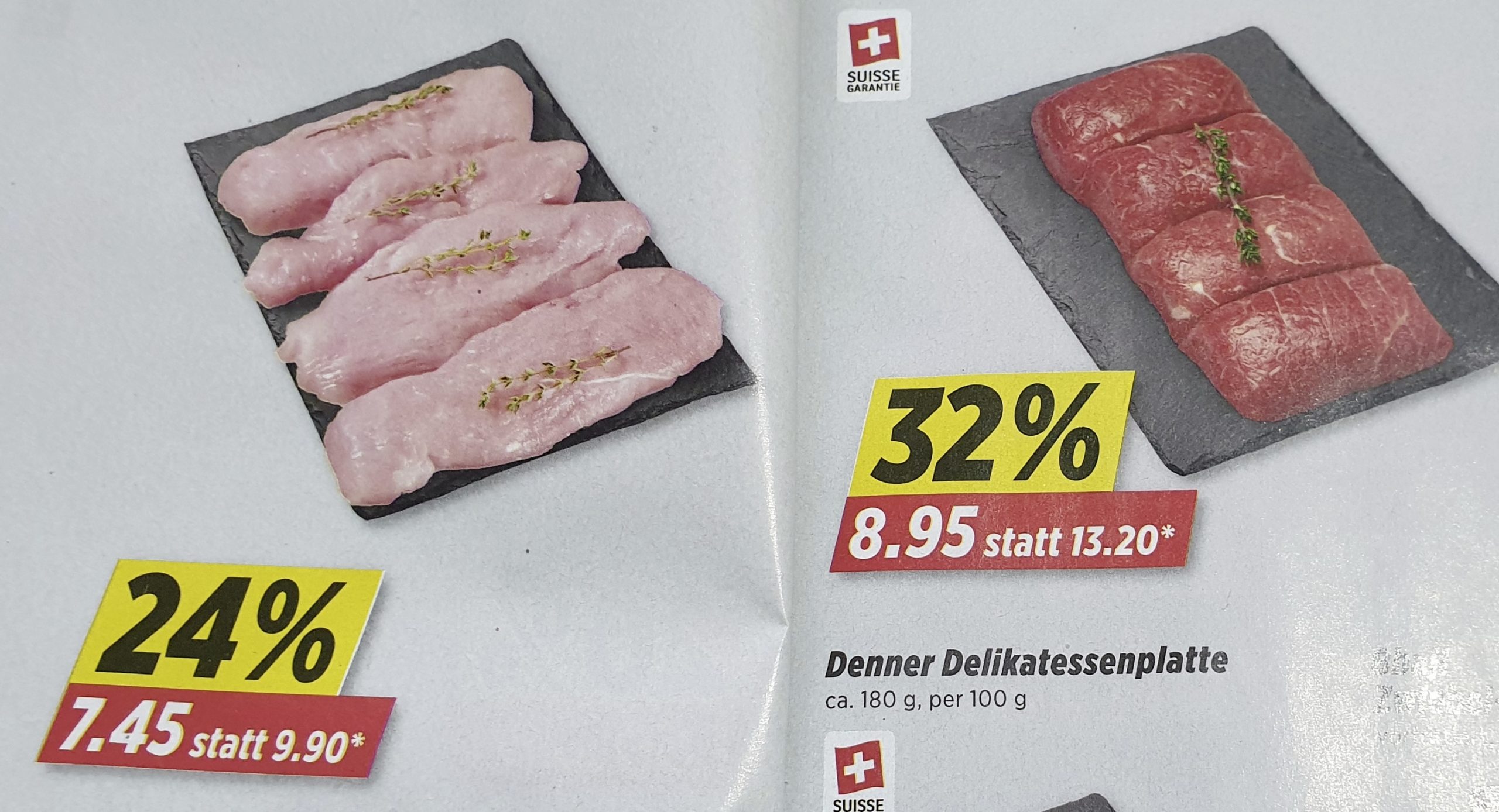 Aktionen für Fleisch werden vom Detailhandel im TV, Zeitungen oder Internet mit viel Geld beworben: «Rindswestern-Steak zum Top-Preis von 1,85 statt 3,75 Fr./kg» bei der Migros, «Schweizer Pouletbrüstli für 1,49 Fr. statt 2,33 Fr./kg» bei Lidl oder der «Schweinehals zum Toppreis von 9.90 für 800 g» bei Denner sind da nur einige Beispiele. Fleischaktionen dienen dazu, Kunden in die Läden zu locken.