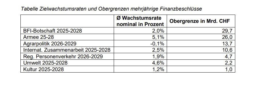 Bei den genannten Zielwachstumsraten und Beträgen handelt es sich gemäss Bundesrat um Obergrenzen, deren Ausschöpfung von der weiteren Entwicklung des Bundeshaushalts abhängig ist. Die finanziellen Aussichten blieben angespannt, mit strukturellen Defiziten in den Finanzplanjahren.