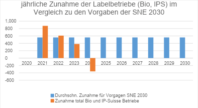 Jährliche Zunahme der Labelbetriebe (Bio, IPS) im Vergleich zu den Vorgaben der SNE 2030.