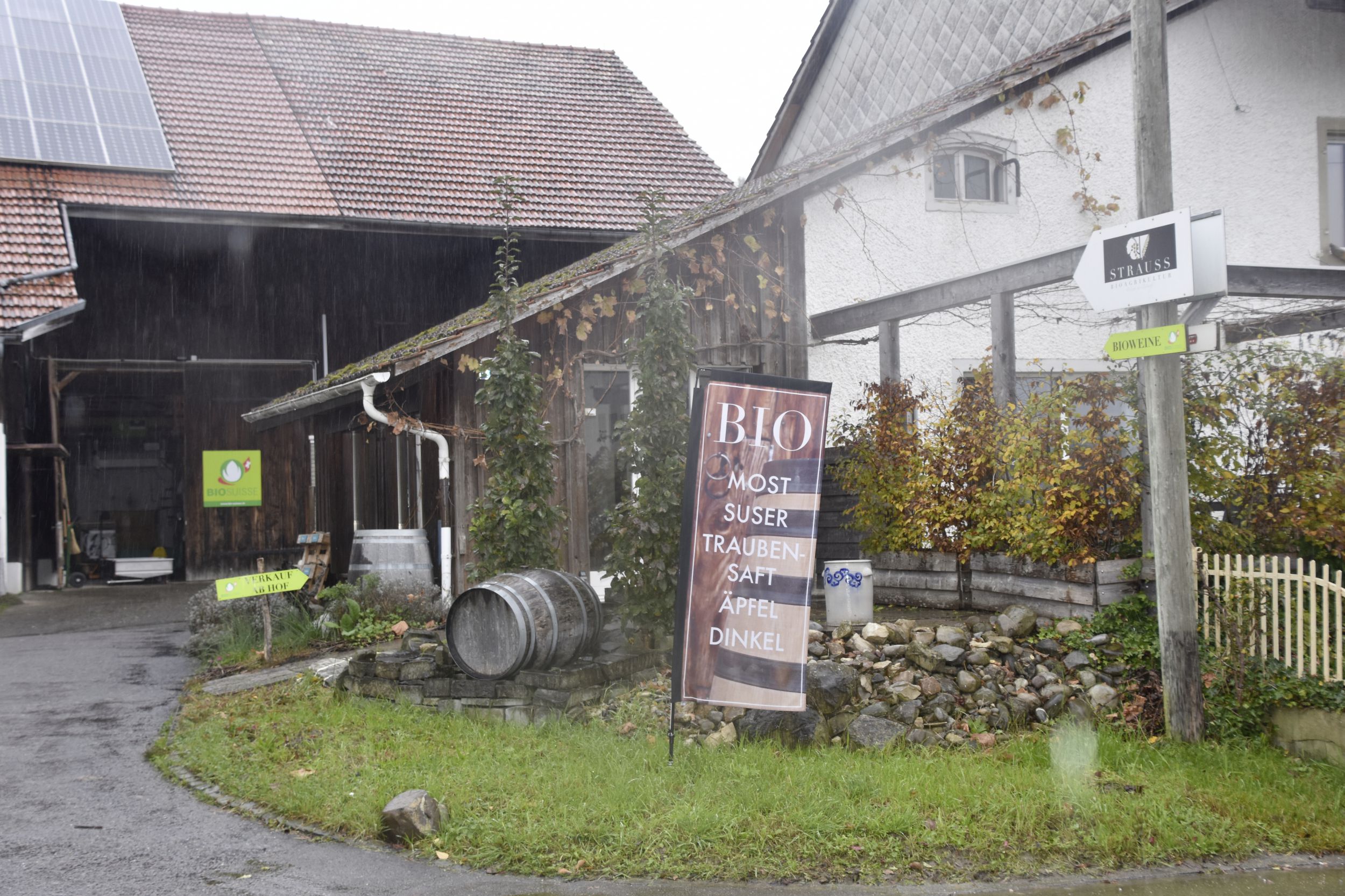 Darauf konnten die beiden aufbauen, als sie im Jahr 2016 den Betrieb mit aktuell 9 Hektaren Eigenland und 3 Hektaren Pachtland übernahmen, übrigens in achter Generation Strauss. Etwa im Weinbau, der in der Region eine grosse Tradition hat: Dort hatte bereits die Elterngeneration auf pilzwiderstandsfähige Piwi-Sorten, naturnahe Eigenkelterung und Direktvermarktung gesetzt. Pascale und Jürg haben zusammen mit BirdLifeZH und dem Naturschutzverein Rickenbach die Rebberge (rund 1 Hektare insgesamt) ökologisch aufgewertet und mit anderen Kulturen ergänzt, etwa Mini-Kiwi.