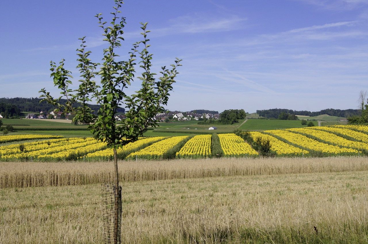 Vor vier Jahren hat die Familie Strauss eine 1,4 Hektaren grosse Agroforstfläche angelegt, die sowohl bei Kunden wie Leute aus der Landwirtschaft auf Faszination und Interesse stösst. «Heuer habe ich über 30 Führungen gemacht. Die Agroforstflächen sind eine wunderbare Plattform, um unsere Kombination von Lebensmittelproduktion und Biodiversitätsleistung zu erklären», so Jürg Strauss. Gepflanzt wurden Apfelbäume, für dessen Ernte die Mosterei Ramseier AG einen langfristigen Abnahmevertrag offeriert hat, zwischen den Baumreihen wuchsen heuer Sonnenblumen, vorher Dinkel und Soja.