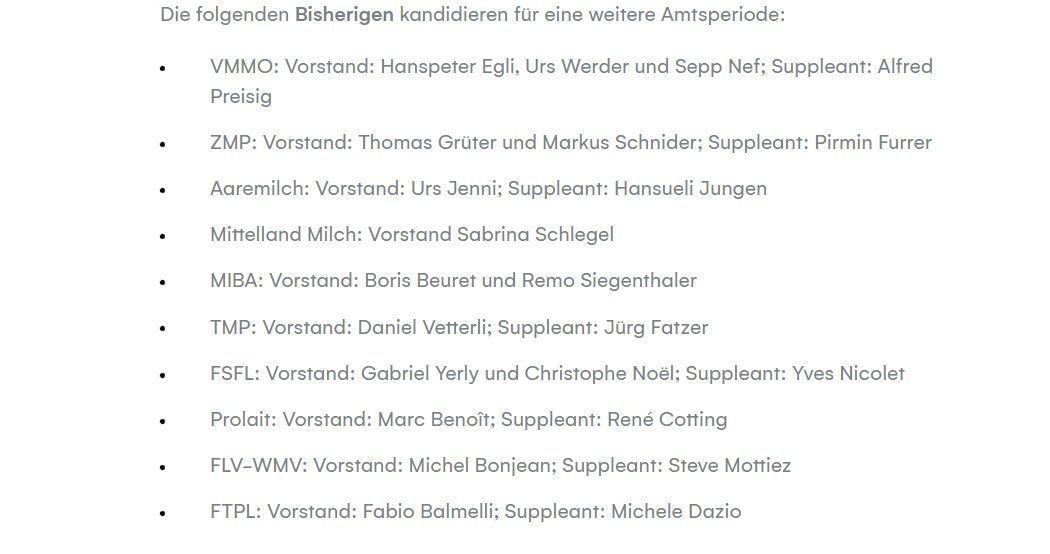 Zu Neuwahlen kommt es auch bei den Suppleanten, den Stellvertretern. Henri-Pierre-Dupraz für die LRG, Andreas Gugger für die Miba, Werner Aeschlimann für den Verein Mittelland Milch und Niklaus Nussbaum für das neue Mitglied VBMC werde von den jeweiligen Mitgliedsorganisation vorgeschlagen. Die weiteren bisherigen Suppleanten kandidieren für eine weitere Amtsperiode.