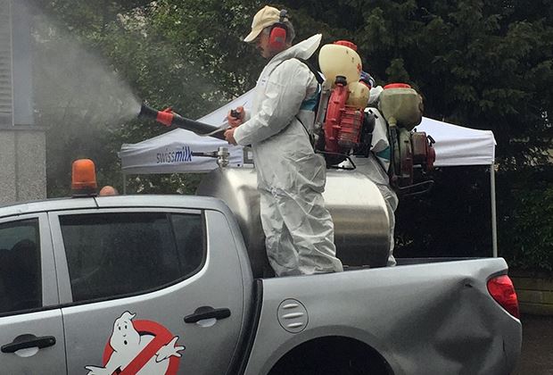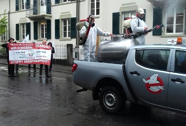 Mit einem Pickup und zwei auf der Ladebühne stehenden Geistervertreibern fuhr die Uniterre am Donnerstagvormittag vor den Sitz der Schweizer Milchproduzenten (SMP) vor. Grund dieser symbolischen Aktion war die Demonstration «Stoppt den Milchfilz». Mit Videointerview und Bildstrecke.