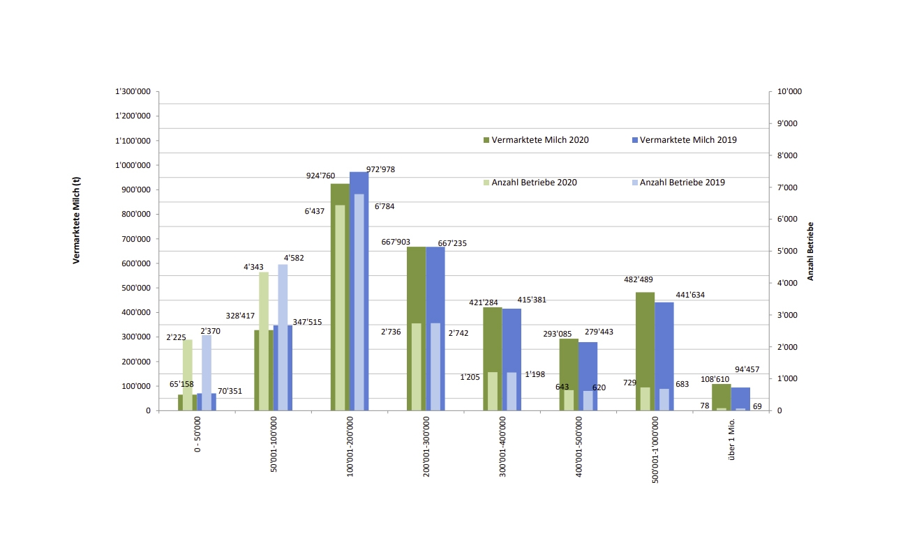Die 15’741 Milchproduzenten (2019: 16‘478) mit einer Erzeugung von bis zu 300‘000 kg erreichen zusammen eine Milchmenge von insgesamt 1'986'238 Tonnen (2019: 2‘058‘079t) oder 60.3 Prozent (2019: 62.6%) der Gesamtproduktion. Die 2655 grössten Milchproduzenten (2019: 2‘570) mit einer Menge von über 300‘000 kg tragen bereits zwei Fünftel (39,7 Prozent)  oder 1'305'468 Tonnen (2019: 1‘230‘915 t) zur Jahresproduktion bei.