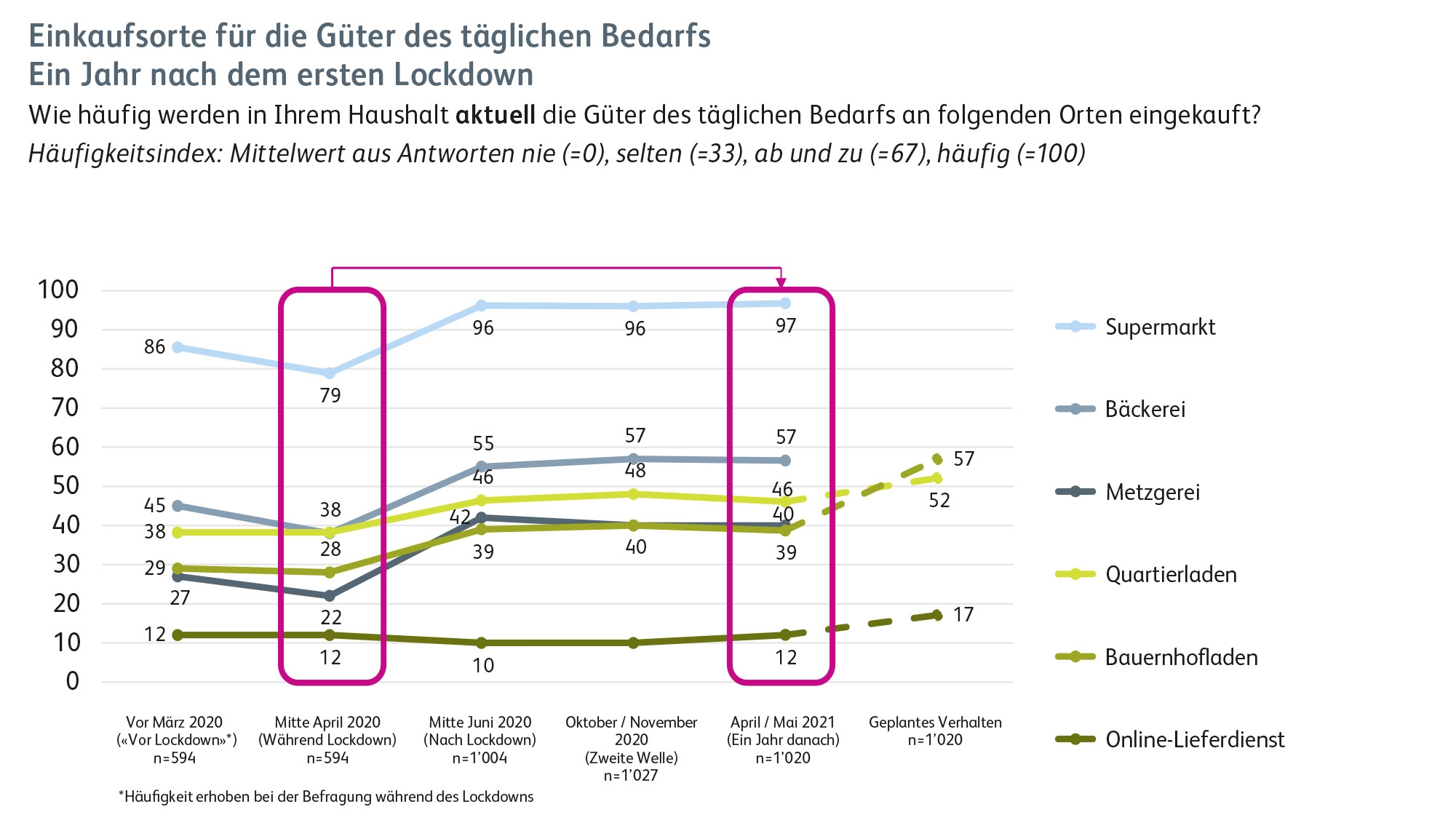 An Beliebtheit gewonnen haben seit Pandemiebeginn die Bäckereien, Metzgereien, sowie Quartier- und Bauernhofläden. Laut den Studienautoren ist das Ausdruck eines Trends zum Einkauf von regionalen Produkten, der schon weit vor Corona begonnen hat und in den in den letzten zwölf Monaten verstärkt wurde. Und viele möchten dies in Zukunft noch häufiger tun.