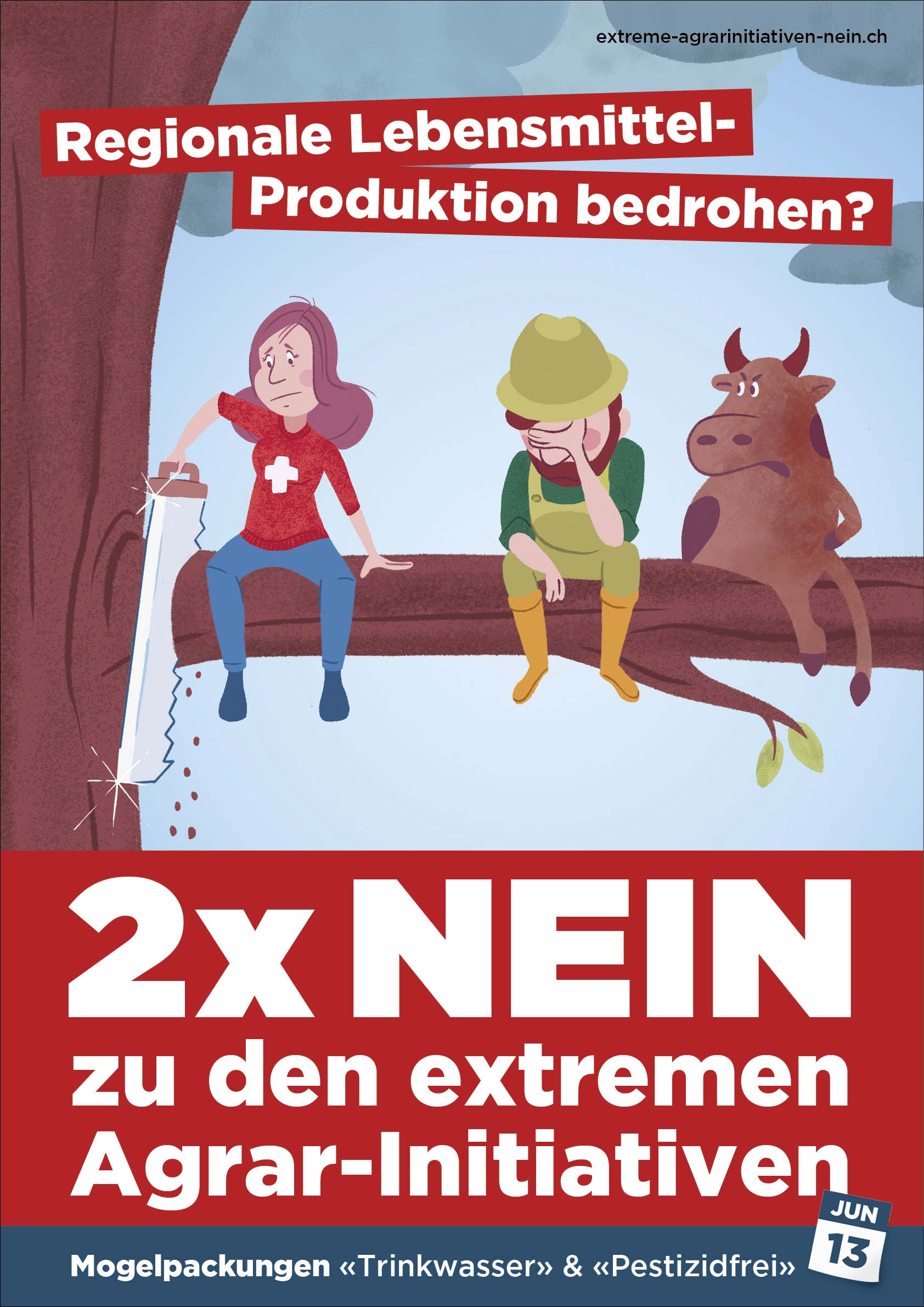 Es stehen fünf verschiedene Sujets sowie eine Spezialversion für Biobetriebe zur Verfügung. Der SBV will mit den Werbesujets die breite Betroffenheit zeigen. Dabei befinden sich alle auf dem gleichen Ast, an dem vorne der Stimmbürger mit einer Säge sitzt. Das soll heissen, dass alle von den beiden Initiativen betroffen sind. Im Vordergrund steht laut Sandra Helfenstein, stellvertretende Kampagnenleiterin des SBV, das Sujet «Regionale Produkte».