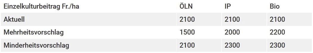 Der Verband fordert den Nationalrat dazu auf, den Minderheitsantrag zu unterstützen. Die Kommissionsminderheit will den aktuellen Betrag von 2100 Franken pro Hektare und Jahr beibehalten und für Bio- sowie IP-Zuckerrüben einen Zuschlag von 200 Franken einführen.