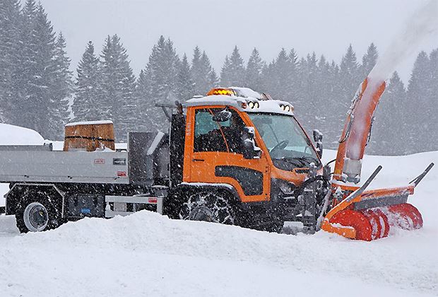 Ebenso kraftvoll fuhr der Aebi-Transporter VT450 Vario 6 mit der Schneefräse Westa und dem Hakengerät mit Kran auf. Selbst schweren Schnee beseitigte er im Kriechgang mit konstanter Leistung. Am robusten Fahrzeug seien die Gänge stufenlos verstellbar, sagte der Präsentator Walter Süess. Es weise gute Fahreigenschaften auf und sei wie ein Lieferwagen zu fahren. Zudem hob er dessen Sicherheit hervor.