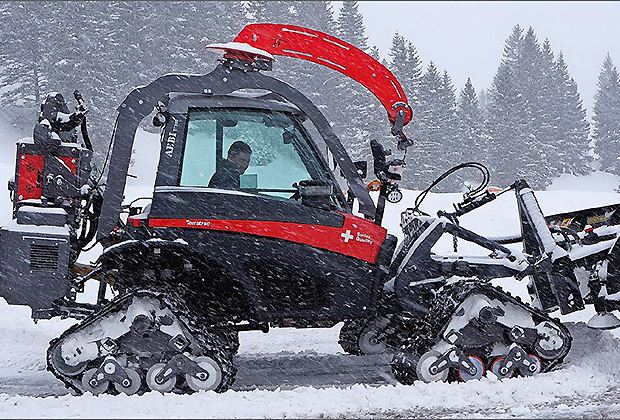 Ein verrücktes Fahrzeug ist der Aebi Terratrac TT280 mit Raupen und Überkopfwinde sowie Schneepflug VP24. Es sei schon dort erfolgreich zum Einsatz gekommen, wo sonst nur wenige hinkämen, nämlich im Ski-Weltcup. Bei einem solchen Einsatz habe es sich um die Schneeräumung auf fertig präparierten Pisten gehandelt. Dabei sei in steilen Partien die Winde unerlässlich gewesen.