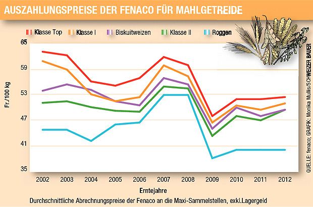 «Die Vermarktung 2012 war geprägt von einer kleinen Brotweizenernte von rund 382'000t. Die Klassenanteile bei Mahlweizen im System Maxi entsprachen in etwa der Nachfrage», erklärte Pius Eberhard von der Fenaco. «Dies, verbunden mit etwas höheren Importpreisen gegenüber dem Vorjahr, führte dazu, dass die Auszahlungspreise an die Maxi-Sammelstellen über dem Vorjahr liegen.»
