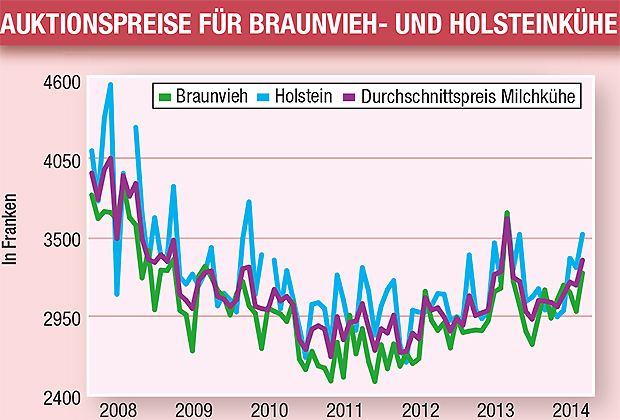Tendenziell lagen die Preise für Nutzkühe im Frühling 2014 leicht über dem Vorjahr. Nun, im Sommer, sind sie leicht unter dem Vorjahresniveau, wie Zahlen des Schweizer Bauernverbandes zeigen. Gegenüber den Jahren davor ist das Preisniveau aber immer noch relativ hoch, was sich auch mit den höheren Milchpreisen im Frühling 2014 erklären lässt.