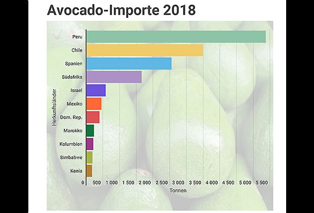 Die Schweiz hat 2018 total 15'529 Tonnen Avocados importiert, das ist dreimal so viel wie noch vor 10 Jahren. Vor allem Südamerika belegt bei den Exporten in die Schweiz Spitzenplätze.