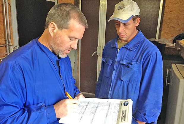 Zur Bestandesbetreuung gehört nicht nur der ausführliche Rundgang durch den Betrieb, sondern auch das Ausfüllen von Papier. Birrer muss auf Formularen Rinerts Schweinemastbetrieb in verschiedenen Kriterien beurteilen – von der Hygiene über die Wasserversorgung bis zu Entwurmungsbehandlungen und Tierzukäufen. Neben dem Ausfüllen der Formulare wirft Birrer auch einen Blick in den Kühlschrank, in dem Rinert die Medikamente lagert. Welche sind drin? Gibt es welche, die abgelaufen sind? Viele Medikamente sind es nicht, die im Kühlschrank stehen – nicht zuletzt darum, weil Birrer Rinerts Schweinebetrieb regelmässig kontrolliert.