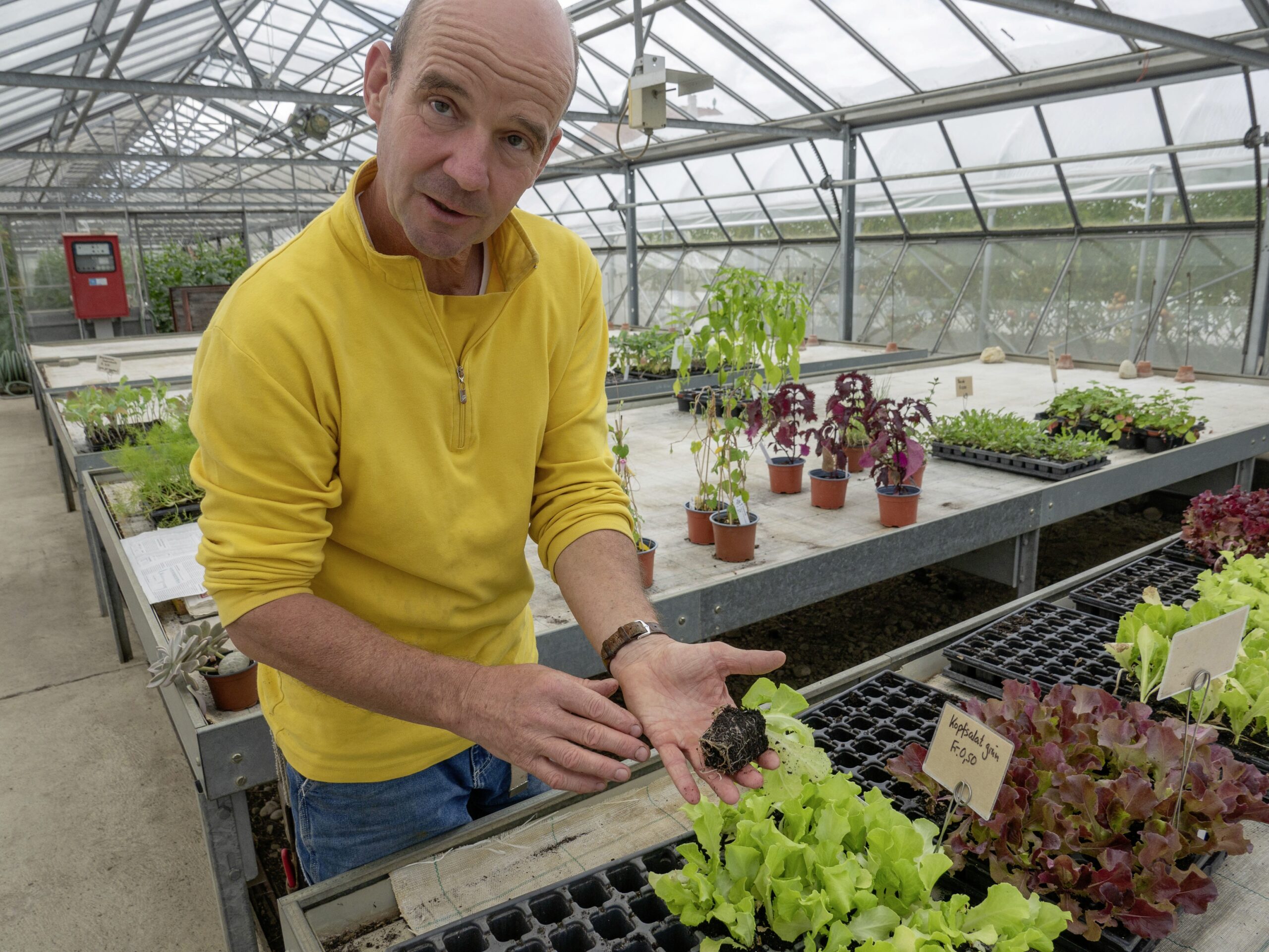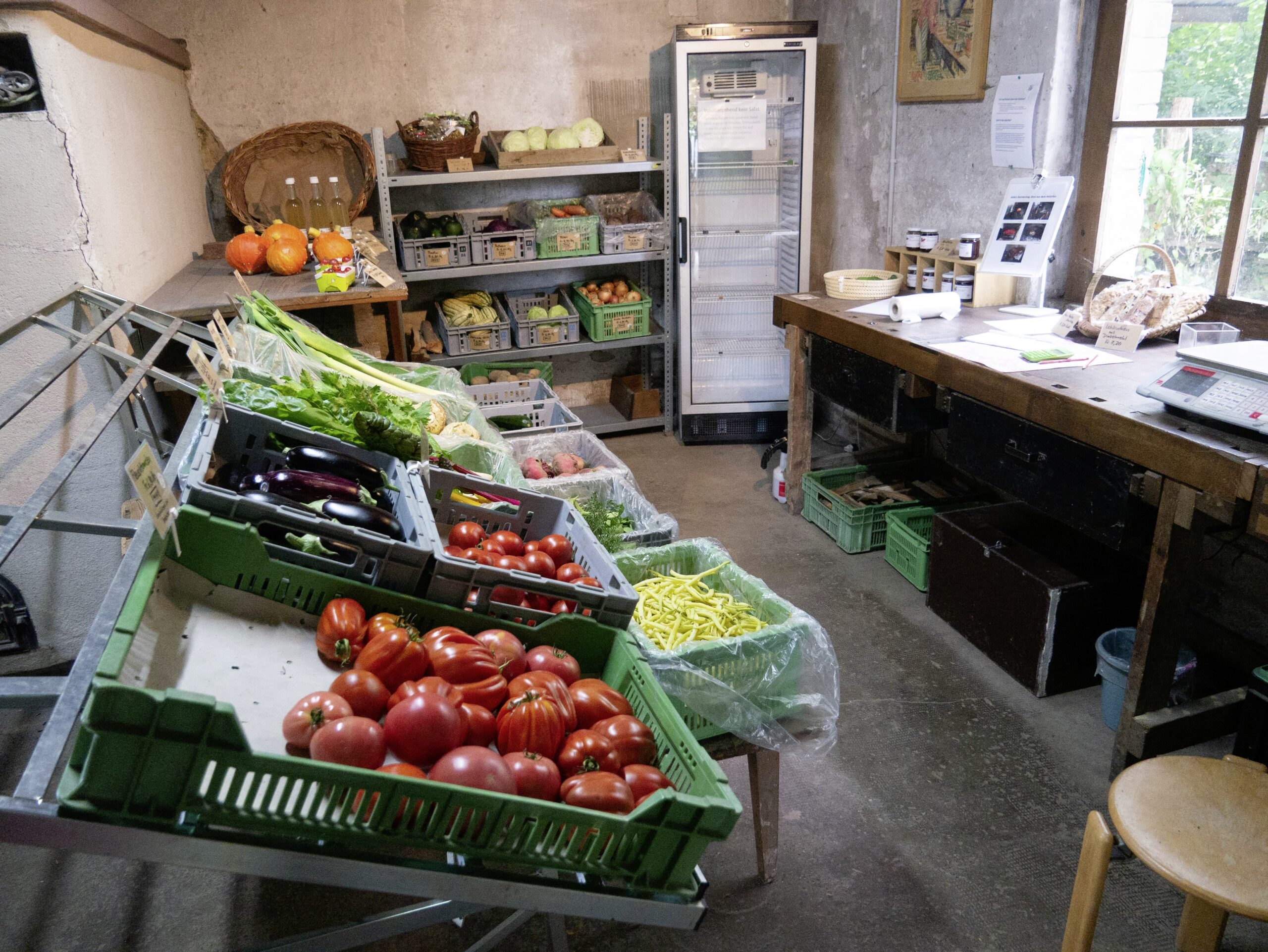 Im schmucken Hofladen stehen die geernteten Produkte bereit, der Setzlingsverkauf findet sich am anderen Ende des Betriebs im Verkaufsgewächshaus. Der kurze Weg dorthin führt entlang von Gemüsebeeten mit Salaten, Brokkoli, Kohl, Kohlrabi sowie von Raritäten.