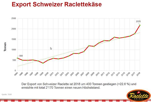 An der Vereinsversammlung von Raclette Suisse wurden die Zahlen des vergangenen Jahres präsentiert. Der Konsum in der Schweiz nahm ab, dafür konnte der Export stark zulegen. Mit 2170 Tonnen wurde ein neuer Rekord realisiert.