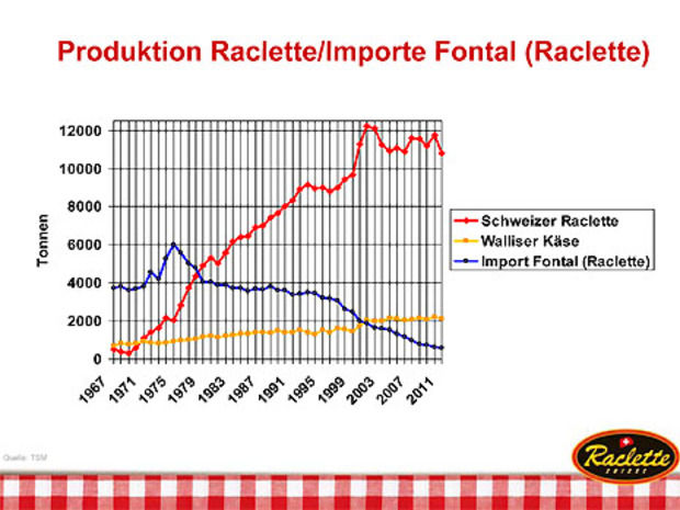 Die Entwicklung des Produktionsvolumens des Käses seit dem Start des Vereins Raclette Suisse im Jahre 1994 ist beeindruckend. Wurden zu Beginn 8943 Tonnen produziert, stieg dieser Wert bis 2012 auf 11’746 Tonnen. Dies entspricht einem Zuwachs von 2803 Tonnen oder 31 Prozent. Die höchste Produktionsmenge wurde 2003 mit über 12’000 Tonnen registriert. Seither bewegt sich diese ungefähr seitwärts.