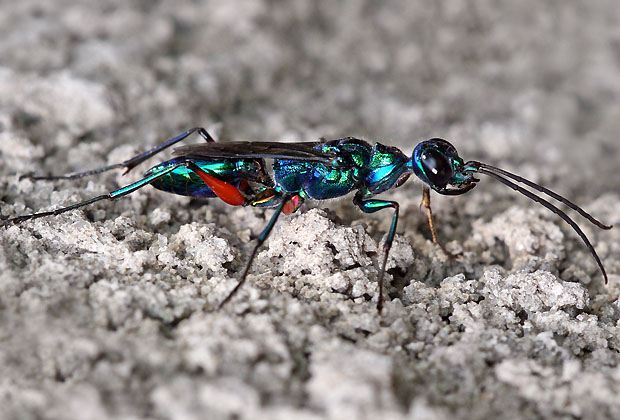 Die Wespenweibchen, die unter anderem in Afrika und Indien vorkommen, sind bei der Verbreitung ihrer Art auf Kakerlaken angewiesen - sie nehmen sie quasi als Geiseln. Sie versetzen die Schabe durch Injektion ihres Giftes in eine Art Lethargie. Die blaugrün schimmernde Wespe zieht die deutlich grössere Kakerlake dann in eine Nisthöhle. Dort legt das Weibchen ein Ei auf die Schabe ab.