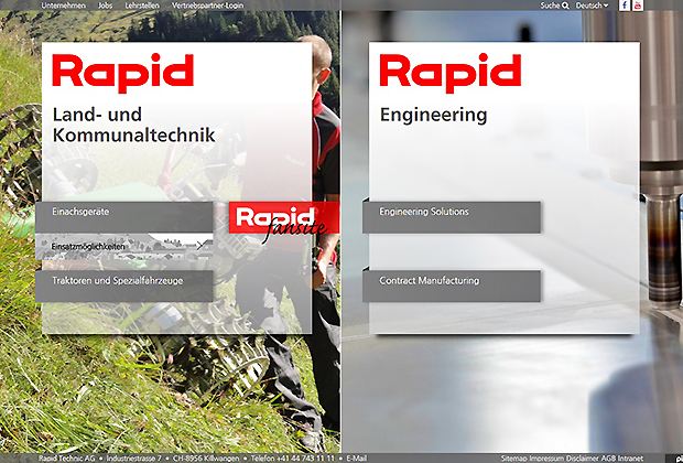 Wird die Seite aufgerufen, hat der Nutzer die Möglichkeit, sich für die Sparte Land- und Kommunaltechnik oder Engineering zu entscheiden. Rapid informiert auf einer virtuellen Landkarte beispielsweise über die Einsatzgebiete des kompletten Einachsgeräte-Sortiments.