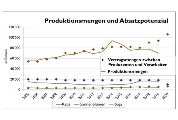 Im Jahr 2020 beträgt die Vertragsmenge 106'000 Tonnen. Zugeteilt werden konnten 99'200 Tonnen. Damit einher geht jedoch deutlicher Rückgang der Vertragsmenge für Sonnenblumen: Sie liegt nur noch bei 9'700 Tonnen, zugeteilt wurden 12'800 Tonnen.