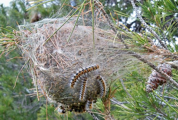 Die Raupen des Pinien-Prozessionsspinner, einem Nachtfalter, der ansonsten vor allem im Mittelmeerraum verbreitet ist, beginnen mit ihrer Wanderschaft, sobald die Tage wärmer werden. Ihre weissen Nester in den Kiefern sind schon in den Wochen zuvor gut zu erkennen. Sie treten in der Schweiz vorwiegend im Tessin und im südlichen Wallis auf.