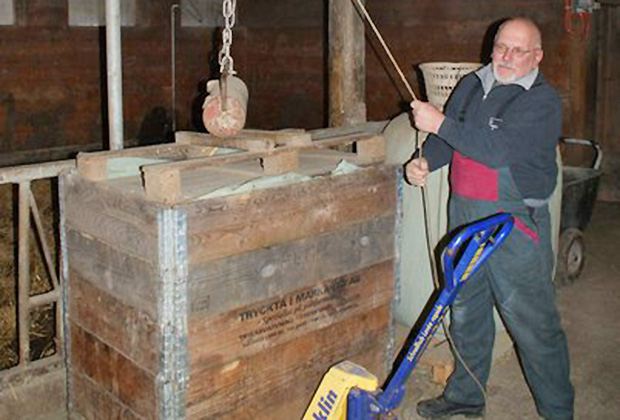 Hansruedi Osterwalder aus Wängi TG steht vor einer grossen Holzkiste im Futtertenn seines Stalles. Obenauf ein 70 kg schweres Gewicht, darunter ein Stapel Silofolien, die er täglich von seinen Quaderballen schneidet. Zum Pressen der Folien zieht der Landwirt das Gewicht an einer Seilwinde nach oben und legt dann die neue Folie auf den Stapel.