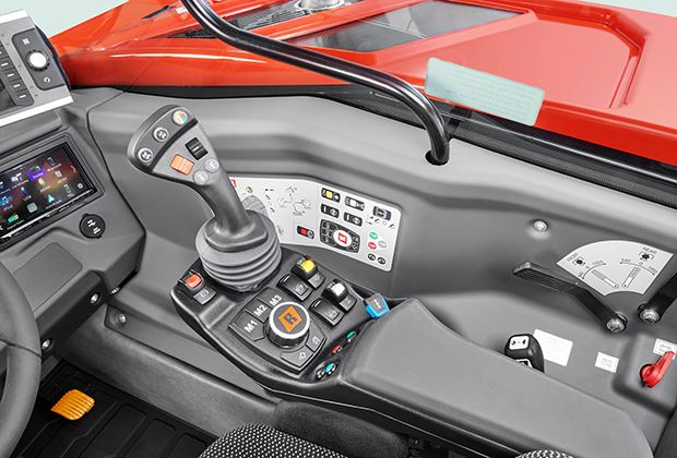 Die Armlehne ist fix mit dem Fahrersitz verbunden und ermöglicht somit ein angenehmes und präzises Arbeiten auch in extremen Hanglagen. Der stufenlose, hydrostatische Antrieb sorgt durch den permanenten Kraftfluss in jeder Fahrsituation für Sicherheit und Komfort. Das zentrale Informationsdisplay (4,3“ TFT LCD) ist mittig angebracht und beinhaltet 3 Analoganzeigen und 32 Kontrollleuchten. Ein Zusatzdisplay ist nach individuellen Wünschen programmierbar und zeigt Hydraulikfunktionen, Fahrzeugzustände, Klimaeinstellungen sowie Warnmeldungen an.