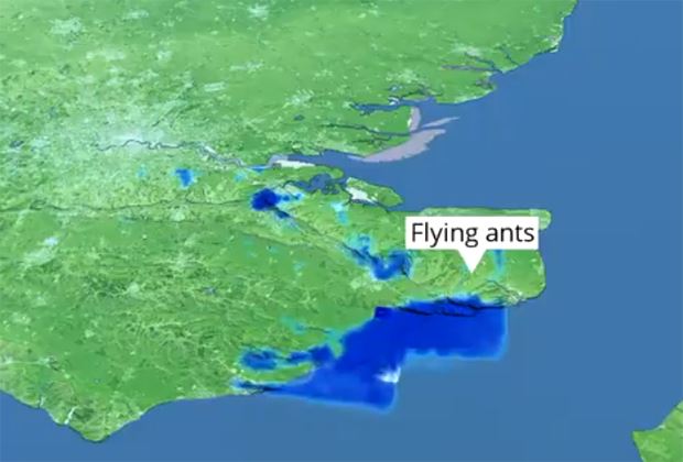 Der britische Wetterdienst (Met Office) hat am Freitag mehrere gigantische Schwärme fliegender Ameisen per Radar entdeckt. Auf einem Video, das vom Met Office per Twitter geteilt wurde, waren auf einer Wetterkarte mehrere vermeintliche Regenfelder über dem Südosten Englands zu sehen.