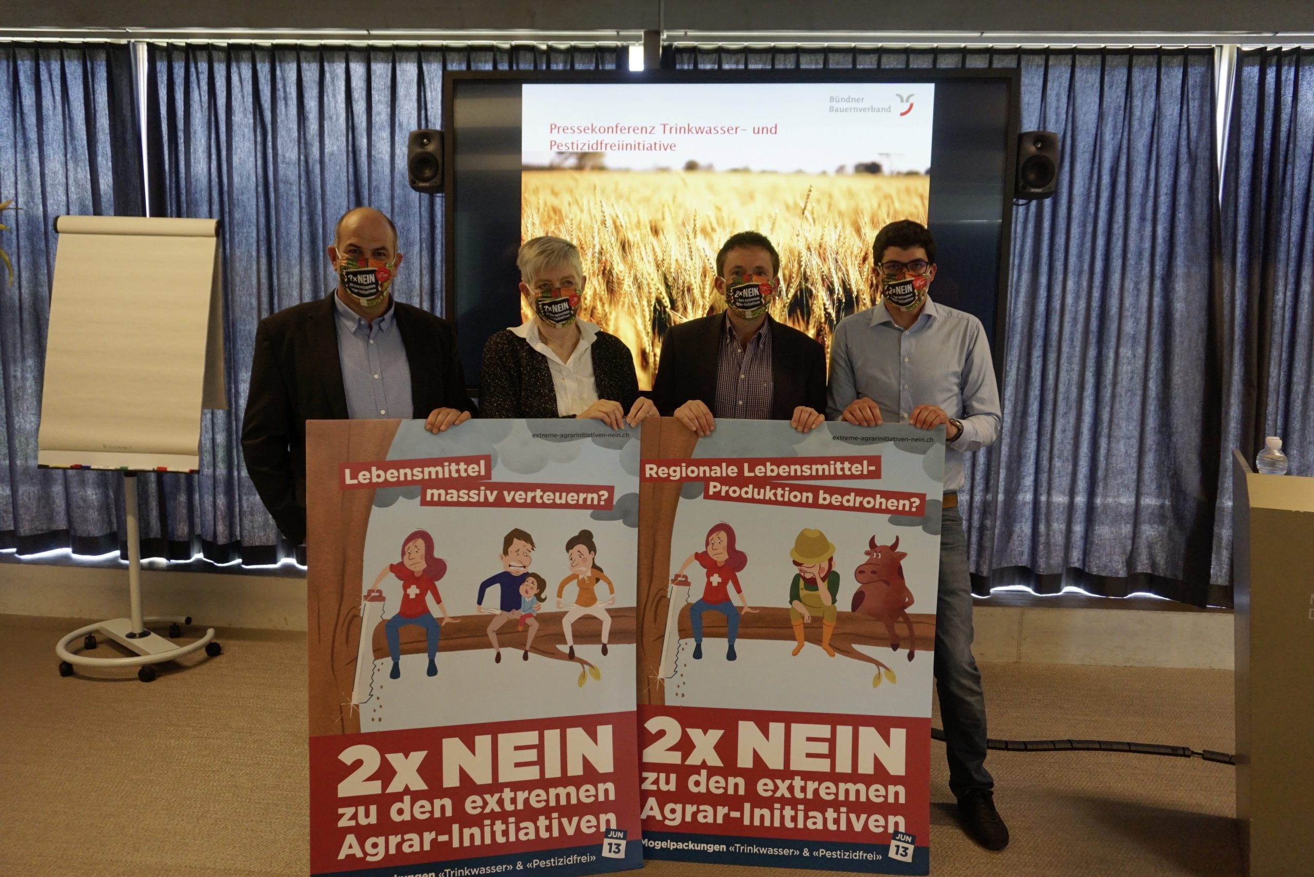 Der Bündner Bauernverband trat am Montag in Chur vor die Medien. Die Trinkwasser-Initiative verlangt, dass nur noch Bauern Direktzahlungen erhalten, die auf Pflanzenschutzmittel, vorbeugend oder systematisch verabreichte Antibiotika und zugekauftes Futter verzichten.