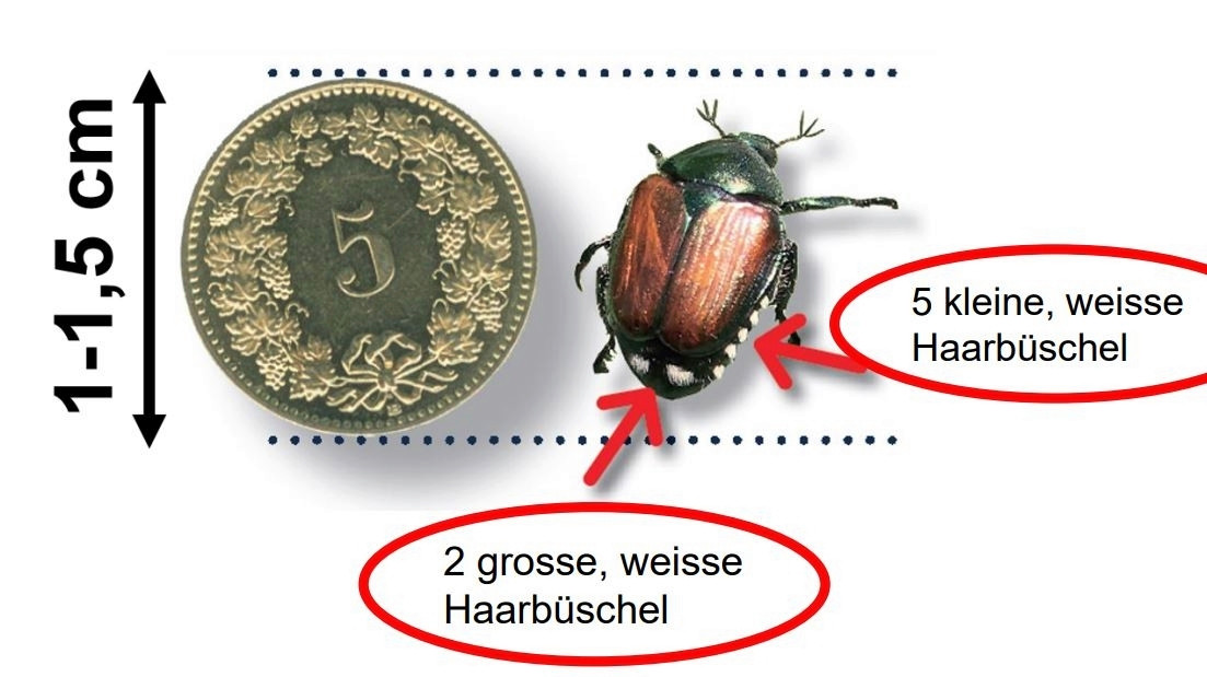 Der ausgewachsene Japankäfer ist so gross wie ein Fünfrappenstück. Seine Flugzeit geht von Juni bis Anfang September. Es besteht damit die Gefahr, dass sich der Japankäfer in anderen Regionen ausbreitet, wenn er bei der Ferienrückkehr aus den befallenen Gebieten in der Schweiz oder in Norditalien unbemerkt per Zug oder Auto eingeschleppt wird.