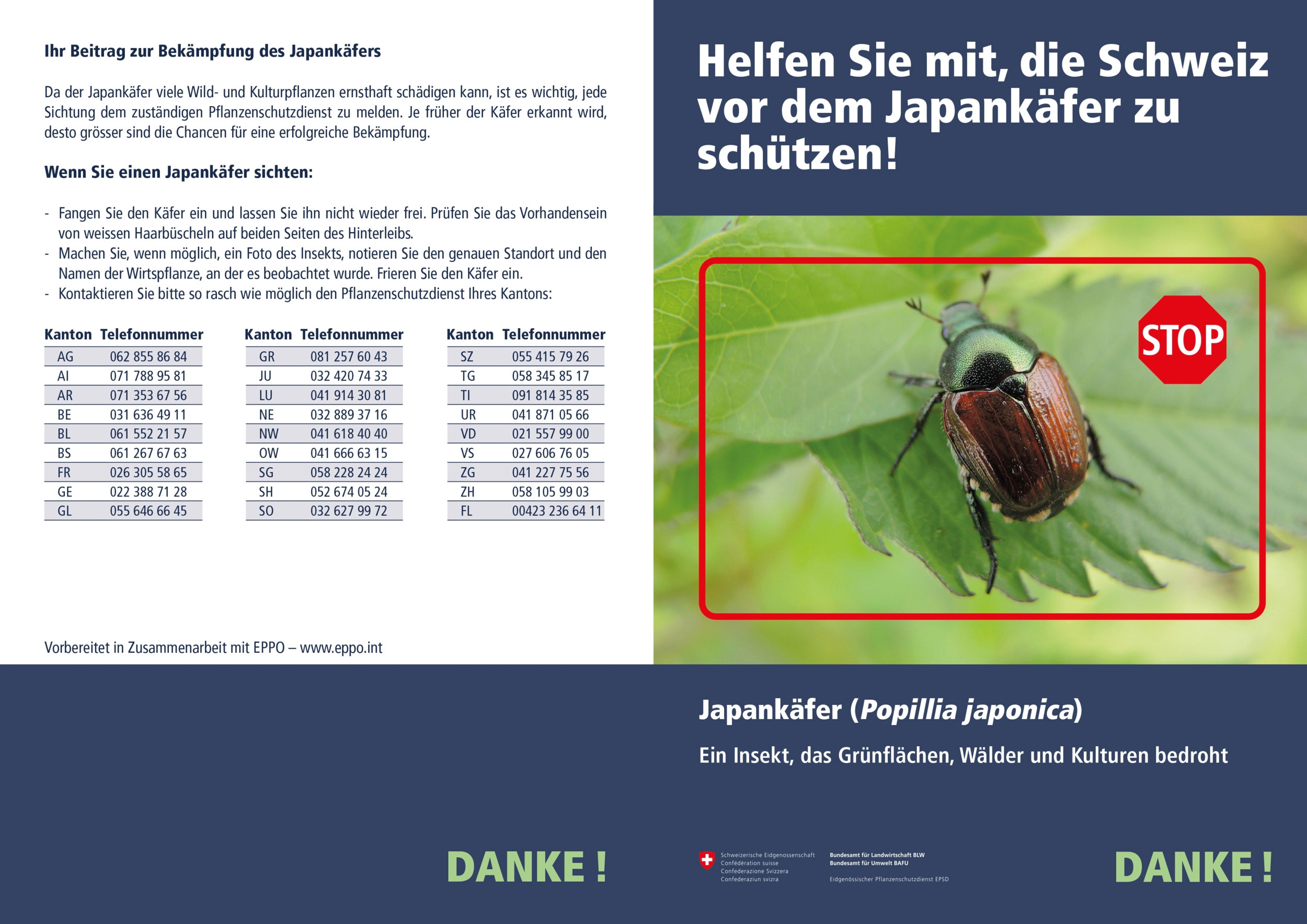 Bei Verdacht eines Japankäfers bitte so rasch wie möglich den Pflanzenschutzdienst Ihres Kantons kontaktieren.