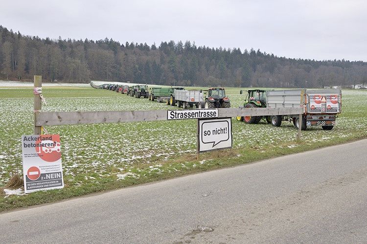 Am Donnerstagvormittag wurde eine weitere Aktion durchgeführt. Landwirtinnen und Landwirte aus der Region protestierten mit einem Traktoren-Korso gegen die geplante Strasse. Die Bauern zeigten mit 70 Traktoren den Verlauf der geplanten Strasse auf. «Die verläuft mitten durch wertvolles Ackerland und zerstört dabei viel Kulturland, ein bedeutendes Naturschutzgebiet und eine wichtige Naherholungszone», schreibt der Verein in einer Mitteilung.