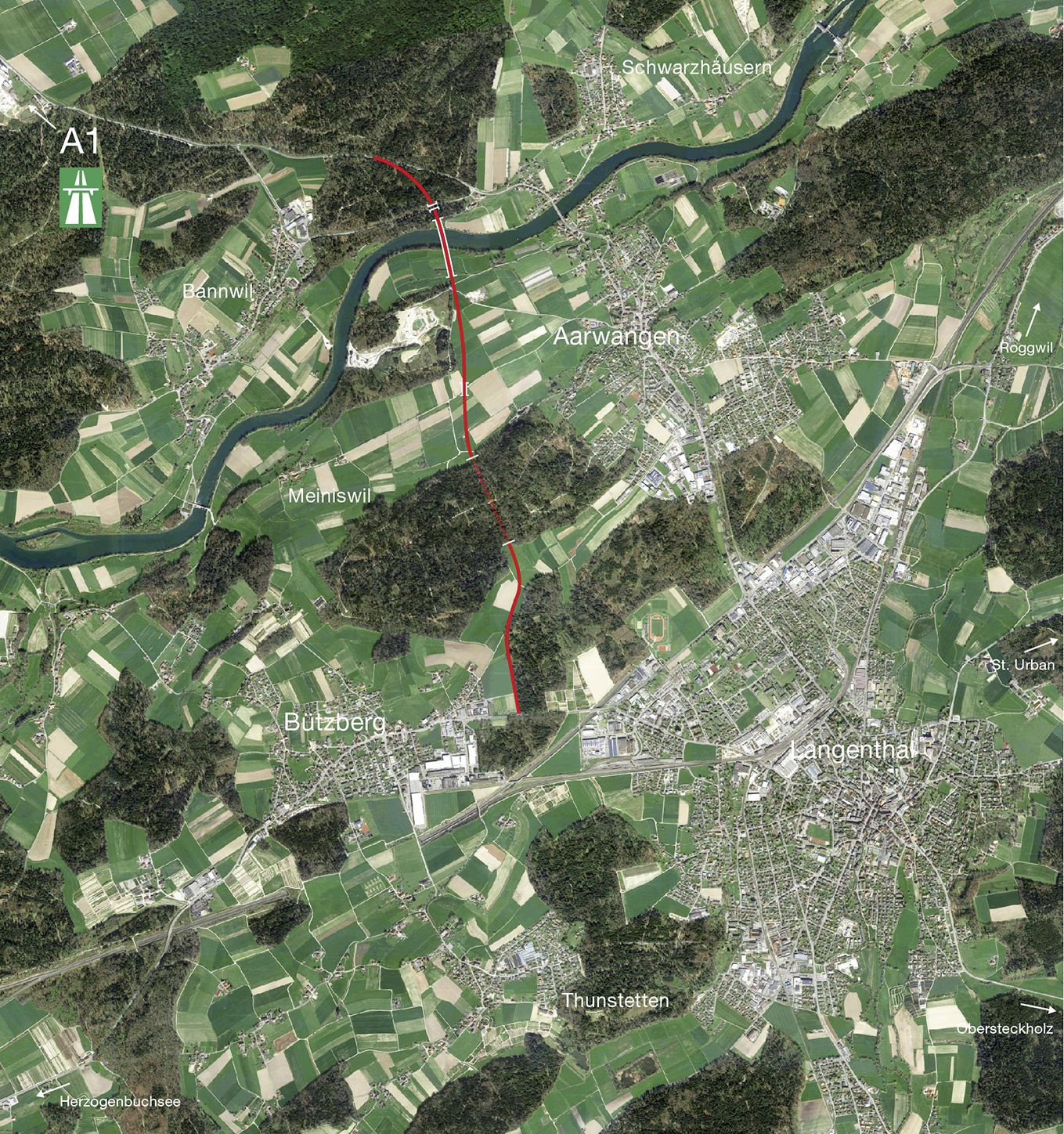 Die neue Strasse zweigt nordwestlich von Aarwangen von der Kantonsstrasse ab, quert die Aare auf einer 480 Meter langen Brücke, führt beim Spichigwald in einen rund 500 Meter langen Tunnel und mündet östlich von Bützberg in die Bern-Zürich-Strasse.