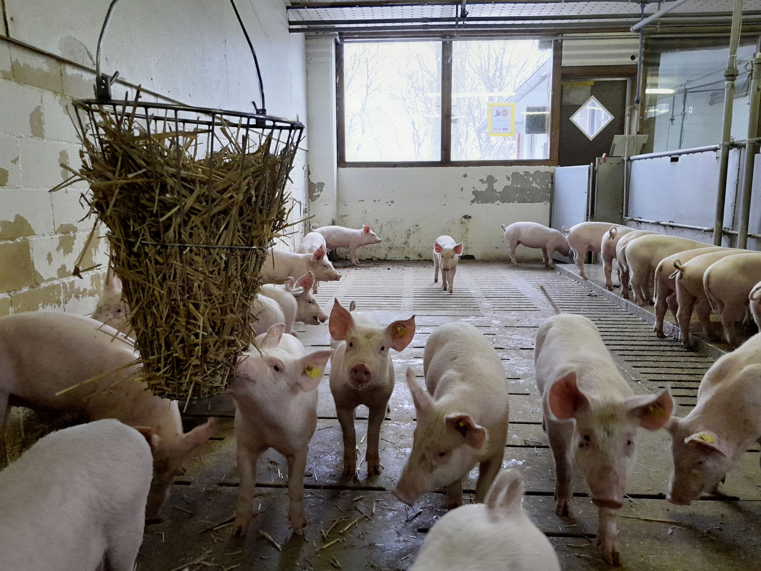 Ein Mastschwein verbringe seine Tage hauptsächlich mit Essen und Schlafen, erklärt Aaron Milz. «Sie haben die Möglichkeit sich frei zu bewegen und sich mit Strohraufen oder Strohwürfel zu beschäftigen, um ihrem natürlichen Trieb gerecht zu werden», fährt er fort. Die Schweine leben in Gruppen von 20 Tieren in sogenannten Buchten. Wenn sie das Gewicht von 60 kg erreicht haben, werden sie nochmals in kleinere Gruppen aufgeteilt, damit sie mehr Platz haben.