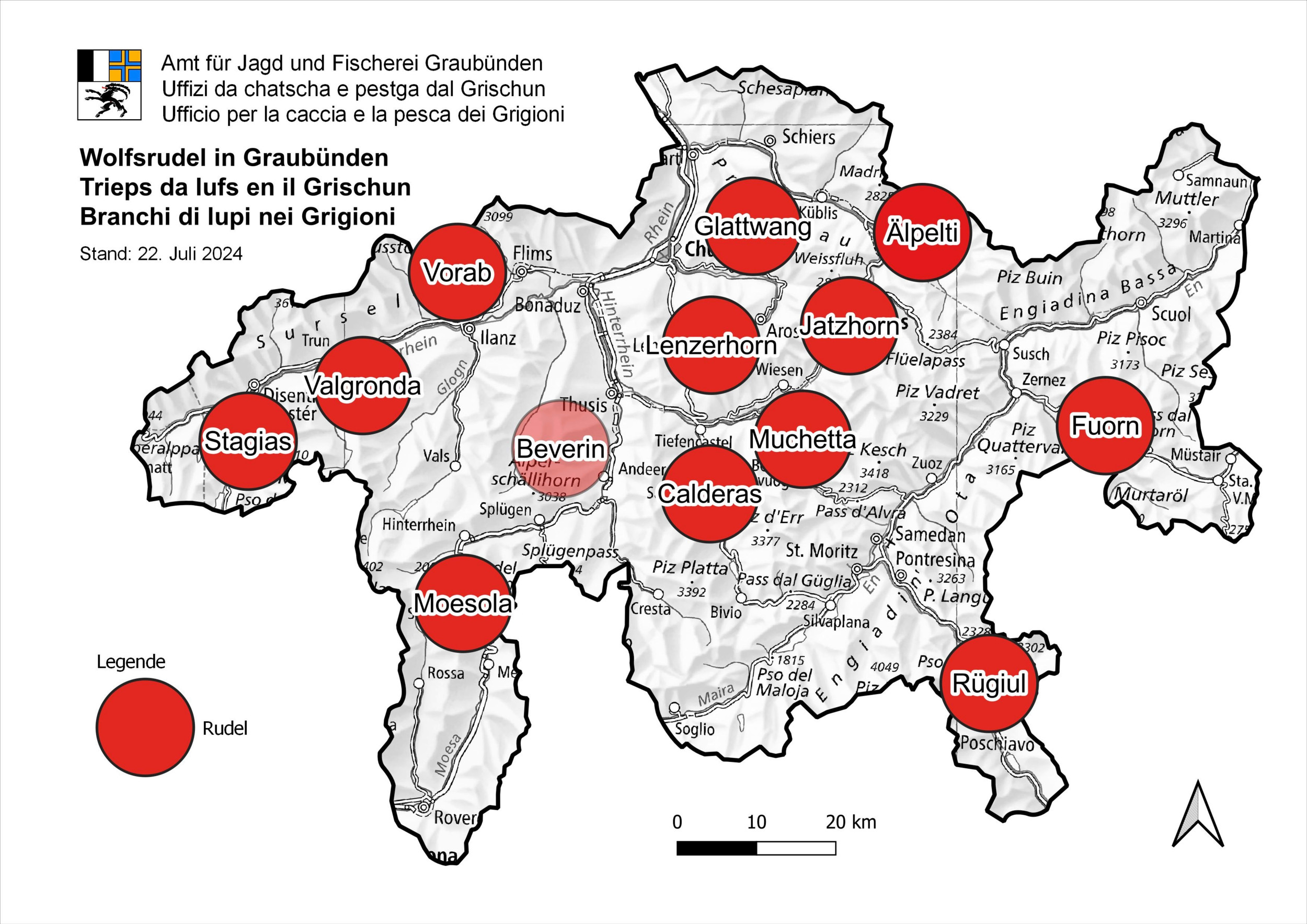 Im Kanton Graubünden gibt es derzeit 12 Wolfsrudel. Das Beverin-Rudel gibt es derzeit nicht mehr.