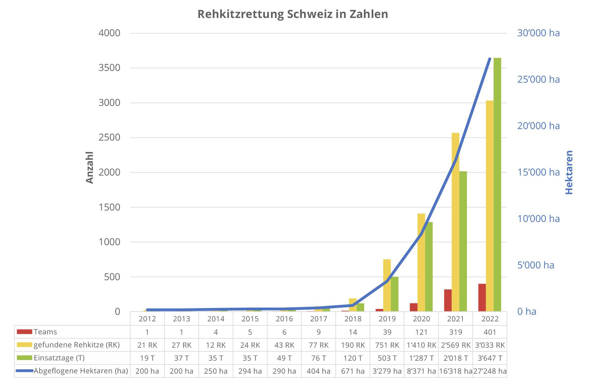 Mit Drohnen hat die Rehkitzrettung in der abgelaufenen Saison zwischen Ende April bis Anfang Juli 3033 Rehjunge vor der Zerstückelung in einer Mähmaschine gerettet. Die Organisation flog mit ihren Geräten während 3647 Einsatztagen über 27’000 Hektaren Wiesen ab.