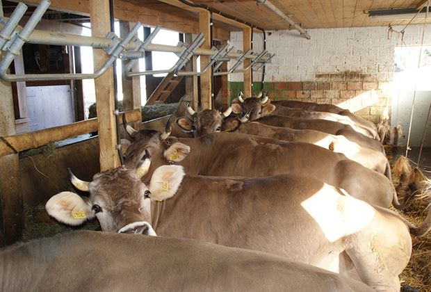 Der traditionelle Appenzeller-Anbindestall ist zwar in die Jahre gekommen, aber die sauberen Kühe und das mit viel Stroh eingestreute Läger zeigen, dass es den Kühen hier gut geht. Es sind ruhige Tiere, die auch vor dem fremden Besucher keine Angst haben. Das dürfte unter anderem daran liegen, dass der Landwirt wieder vermehrt Original Braune Kühe (OB) im Stall hat.