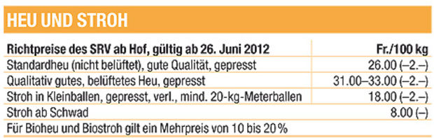 Der Ausblick im Heuhandel wird durch grössere Erntemengen, tiefere Milchpreise sowie agrarpolitische Perspektiven, Höhe der Tierbeiträge, getrübt. Die Tierhaltung werde so sicher nicht attraktiver, lautete das Fazit. Bei der Preisfindungsrunde wurden deshalb die Zuschläge der Winterversammlung von November 2011 rückgängig gemacht.